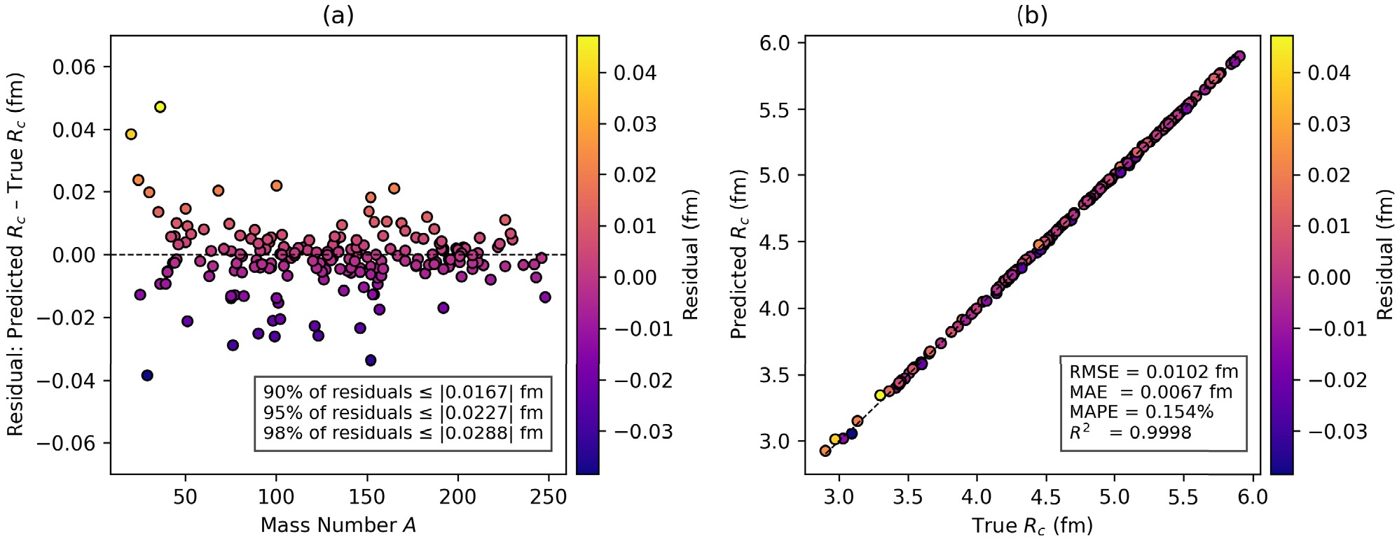 $ \text{Predicted } R_c - \text{Actual } R_c $ ) are plotted against the atomic mass number A, and color encoding indicates the magnitude of residuals. This plot reveals that most of the points are tightly concentrated at the central zero error line, with very few outliers. The inset quantifying the residual distribution is added, which shows that 90%, 95%, and 98% of the absolute errors are below 0.0167 fm, 0.0227 fm, and 0.0288 fm, respectively. This proves that the model's errors are consistently low, and very few predictions have errors beyond 0.03 fm. Importantly, no systematic bias over the whole range of mass numbers is observed. A few outliers can be seen with relatively higher residuals, suggesting the model's limitation in the scarce light-nuclei region of the nuclear chart. Panel (b) illustrates the correlation between predicted and true charge radii, which is an excellent agreement along the ideal$ y=x $ line. The inset in the panel (b) shows the performance metrics showing RMSE = 0.0102 fm, MAE = 0.0067 fm, MAPE = 0.154%, and$ R^2 $ = 0.9998, which means that our model can explain approximately 99.98% of the variance in the nuclear charge radius. -