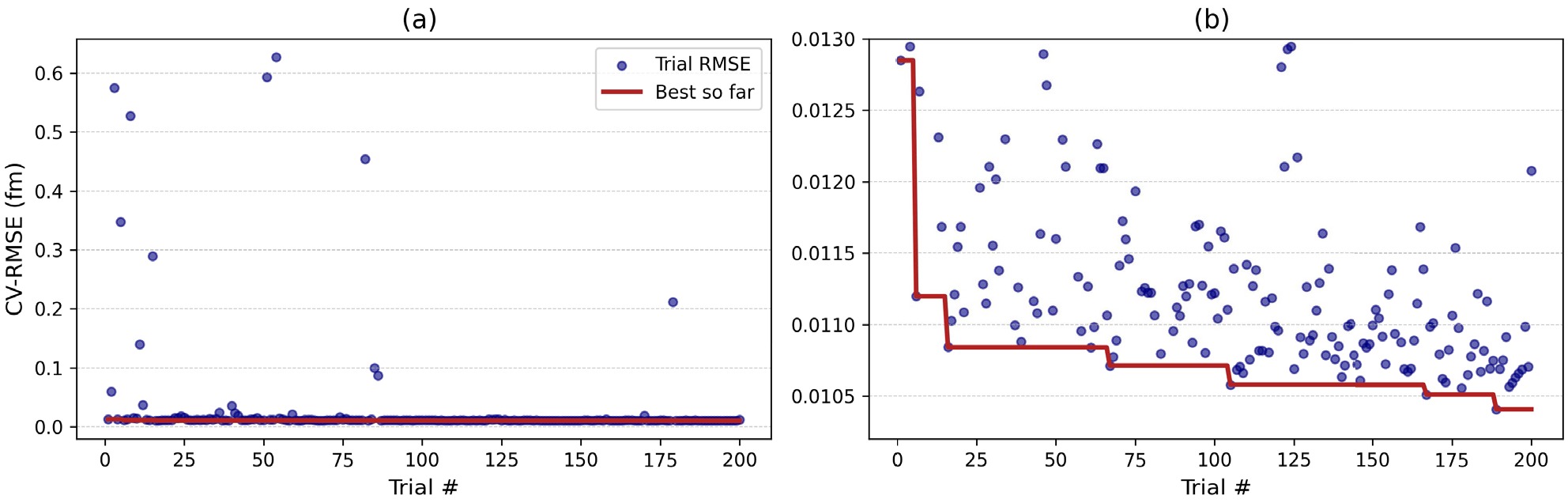 Figure 4. (color online) Optuna CV-RMSE progress over 200 trials. (a) Full-range CV-RMSE history for all trials. (b) Zoomed-in view (outliers clipped).
