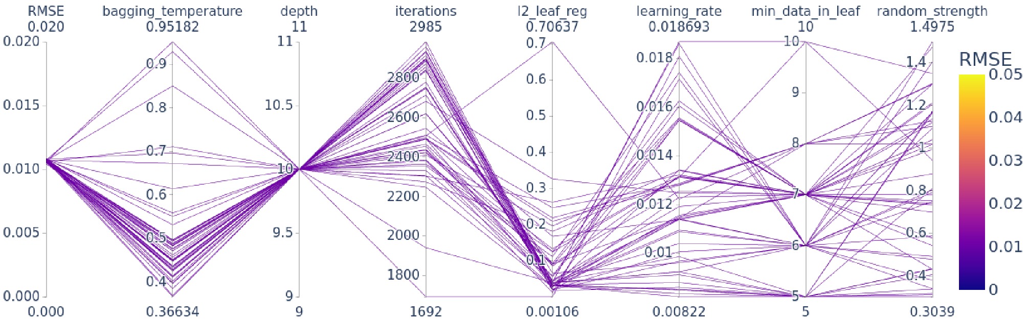 Figure 5. (color online) Parallel-coordinates plot of the top 50 Optuna trials, showing the sampled hyperparameter values and their corresponding 10-fold CV-RMSE (color-coded).