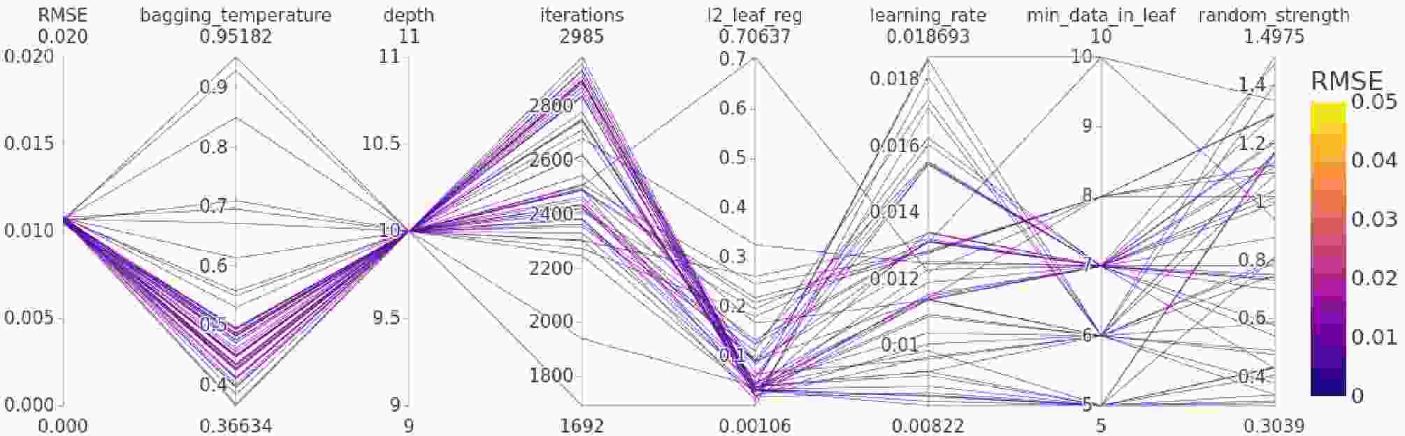 The model was then tuned for the best possible predictive performance by searching for optimal hyperparameters. Hyperparameters are selected via Optuna’s Tree-Structured Parzen Estimator (TPE) sampler. The search was performed with 10-fold cross-validation by targeting the minimum average RMSE across all folds. In total, 200 Optuna trials were executed, and each trial's metadata was stored in a relational database file, which we queried later to analyze search history using the Optuna “best-so-far” plot (Fig. 4), and hyperparameter interactions were studied using a parallel-coordinate plot (Fig. 5). The full search space is summarized in Table 2.