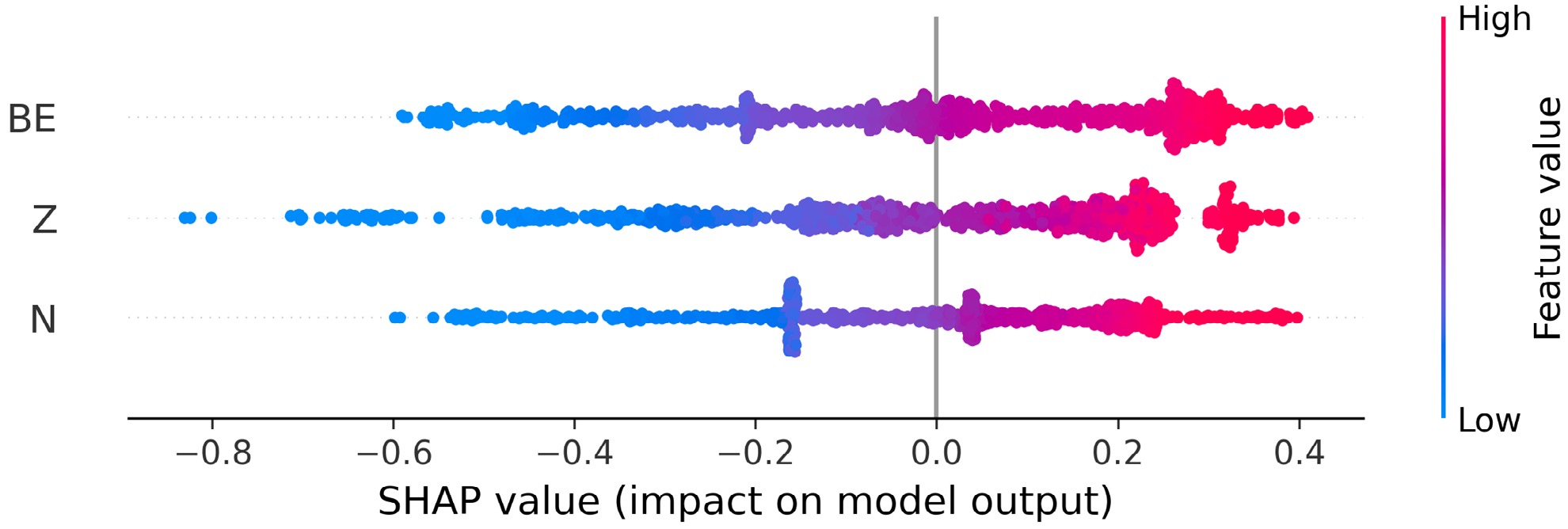 $ R \approx A^{1/3}, $ nuclei with higher BE usually produce positive SHAP contributions, so in general (for local chain-level, see Section 4.3.1), charge radius increases with an increase in BE. Conversely, lower BE corresponds to a negative SHAP value, reflecting smaller charge radii.Quantitatively (see Table 7), BE achieves the highest mean absolute SHAP (0.223), followed by Z (0.213) and N (0.176), demonstrating that it drives model output more strongly on average. Z exhibits the largest SHAP range (-0.83 to +0.39), showing that extreme atomic numbers can both strongly increase and decrease predicted radii. The near-zero mean SHAP values (