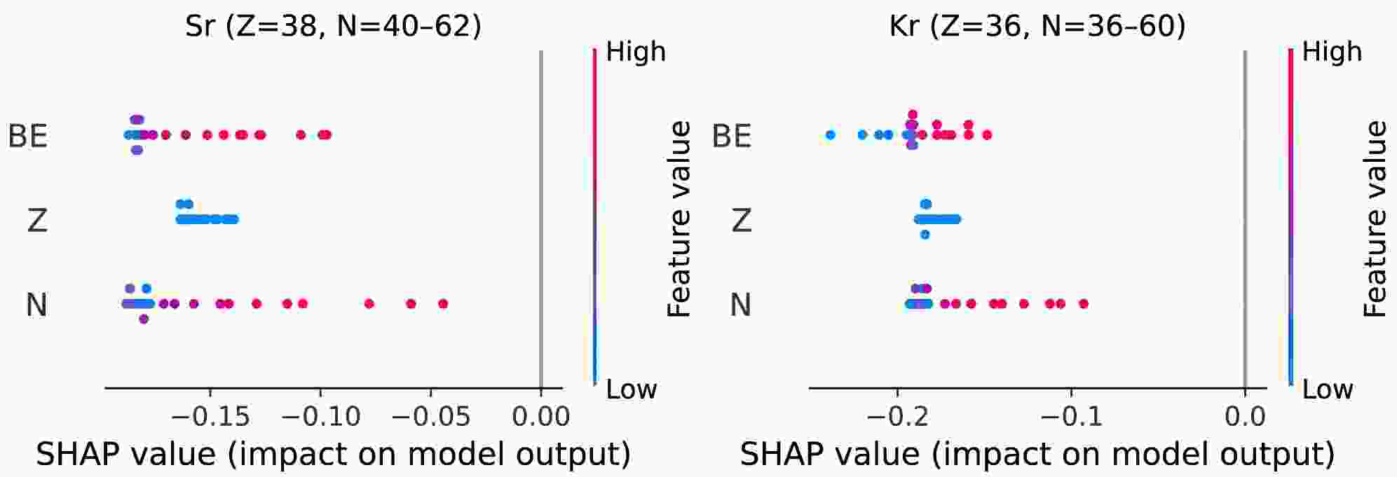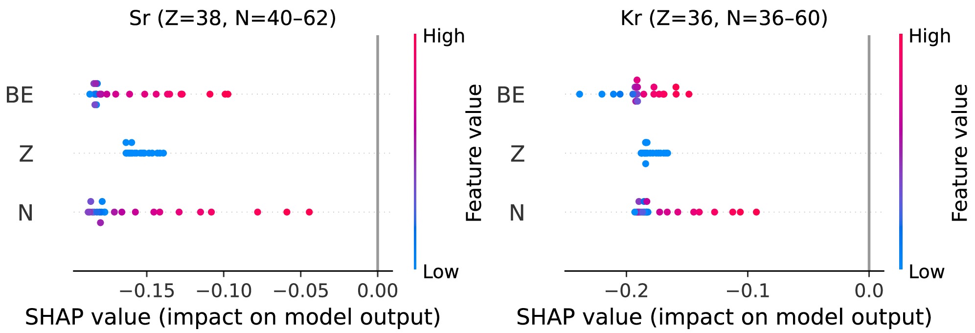 We also explore the localized SHAP for Sr (Z = 38) and Kr (Z = 36) chains, computed using an interventional TreeExplainer on a global background sampled from the whole training set. This common baseline stabilizes the sign and scale of attributions and we interpret results within each chain.