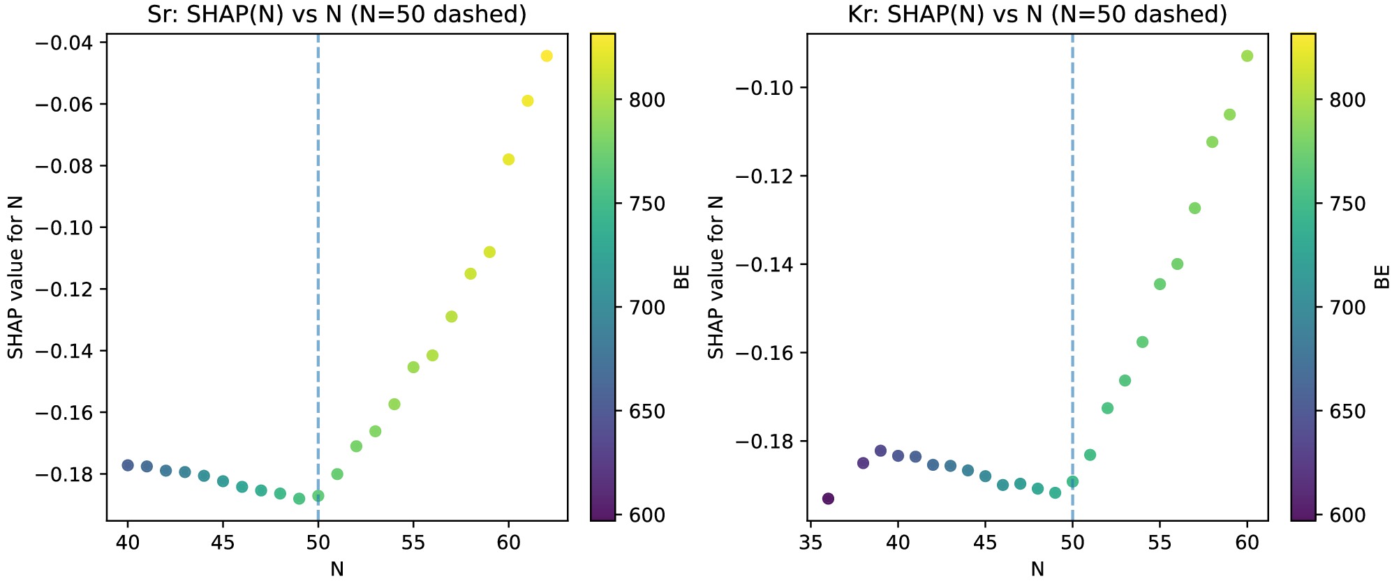 $ {\rm{SHAP}}(N) $ on N (Fig. 8) shows a sharp minimum at$ N \approx 50 $ . For$ N<50 $ adding more neutrons yields negative contributions (model predicts charge radius below the global expectation), whereas for$ N>50 $ the contributions recover toward zero, indicating a trend reversal across the shell closure. When$ BE $ is included as a feature, color-coding shows that although$ BE $ rises with N, the most negative$ {\rm{SHAP}}(N) $ appears near$ N \approx 50 $ , demonstrating that at magic number, the local shell effects can override the global trends. -