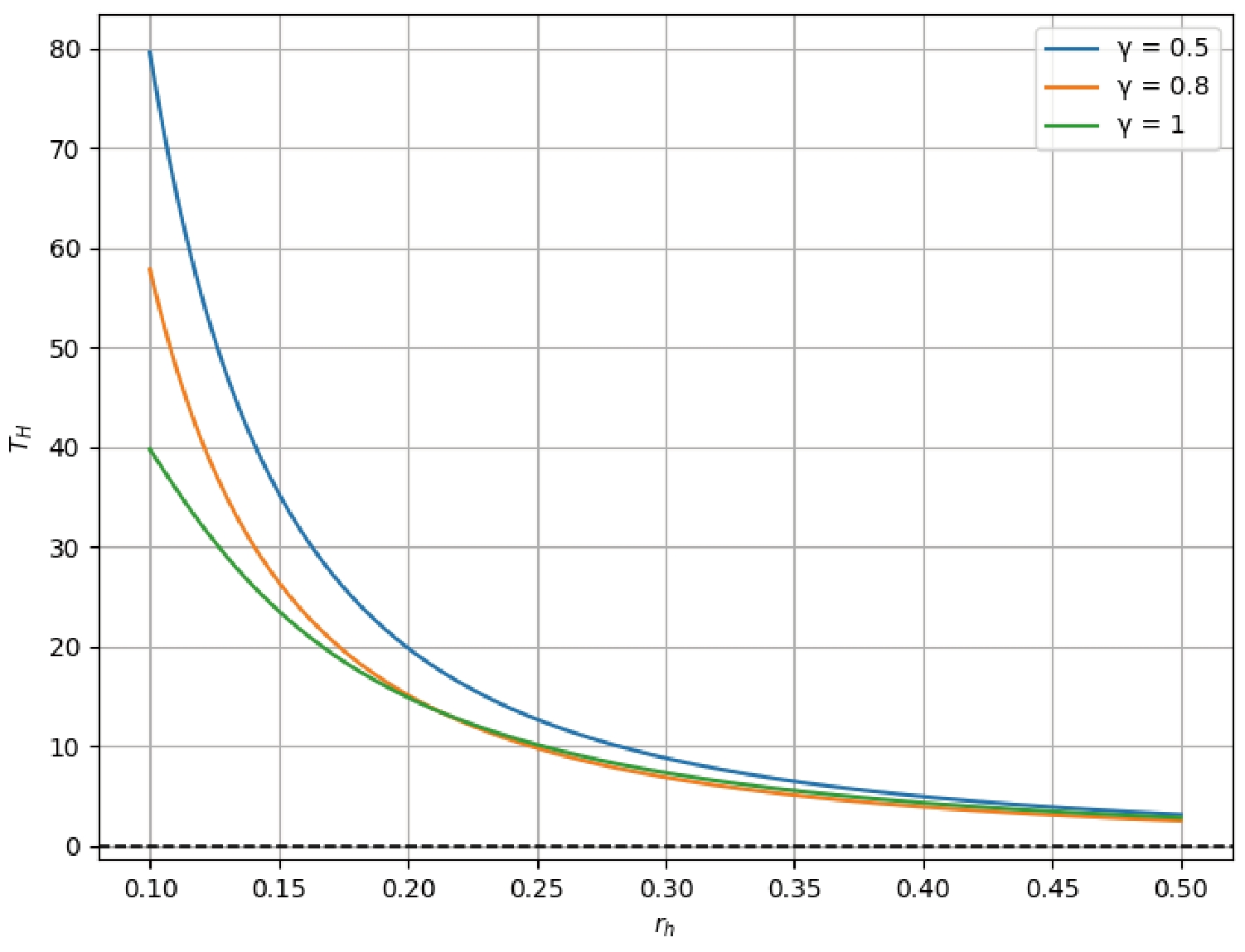 $ r_h $ and decreases rapidly as$ r_h $ increases. The nonlinearity parameter γ significantly affects the temperature profile, with smaller values of γ leading to more pronounced temperature increases at small radii. This behavior has important implications for the final stages of black hole evaporation, suggesting that nonlinear electromagnetic effects could substantially modify the standard picture of black hole thermodynamics.Figure 1. (color online) Plot of Hawking temperature