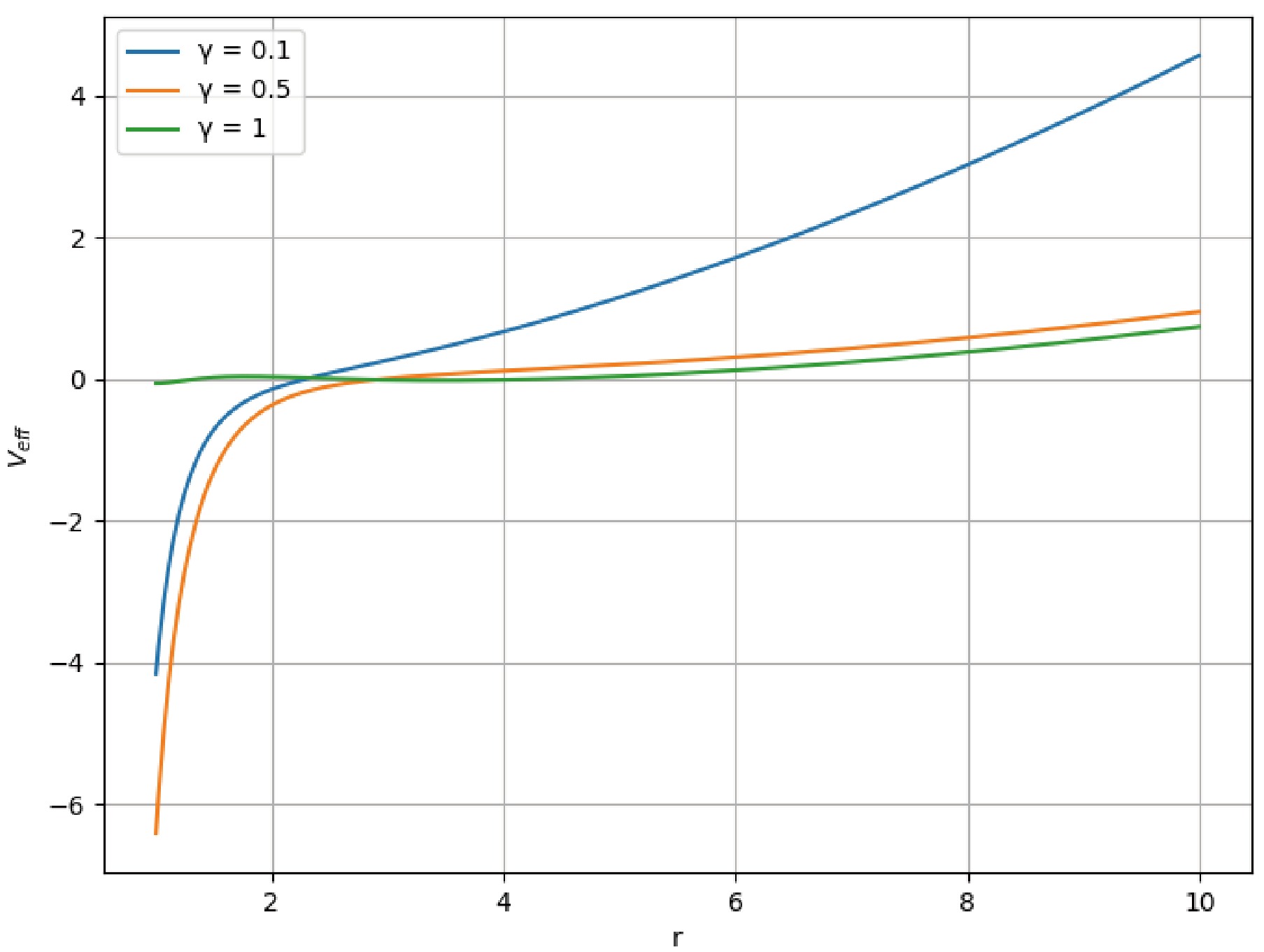 $ V_{\text{eff}} $ with respect to the radial coordinate r for different values of the nonlinearity parameter γ. The plot reveals important features of the potential profile.Figure 2. (color online) Variation of the effective potential