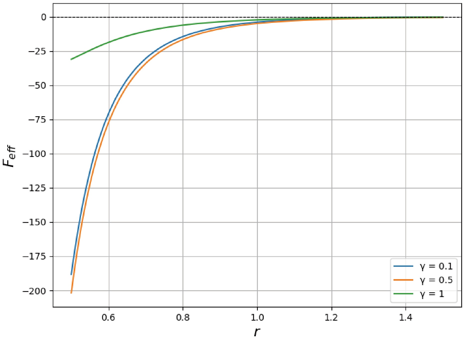 $ F_{\text{eff}} $ with respect to the radial coordinate r for different values of the nonlinearity parameter γ:Figure 3. (color online) Variation of the effective force
