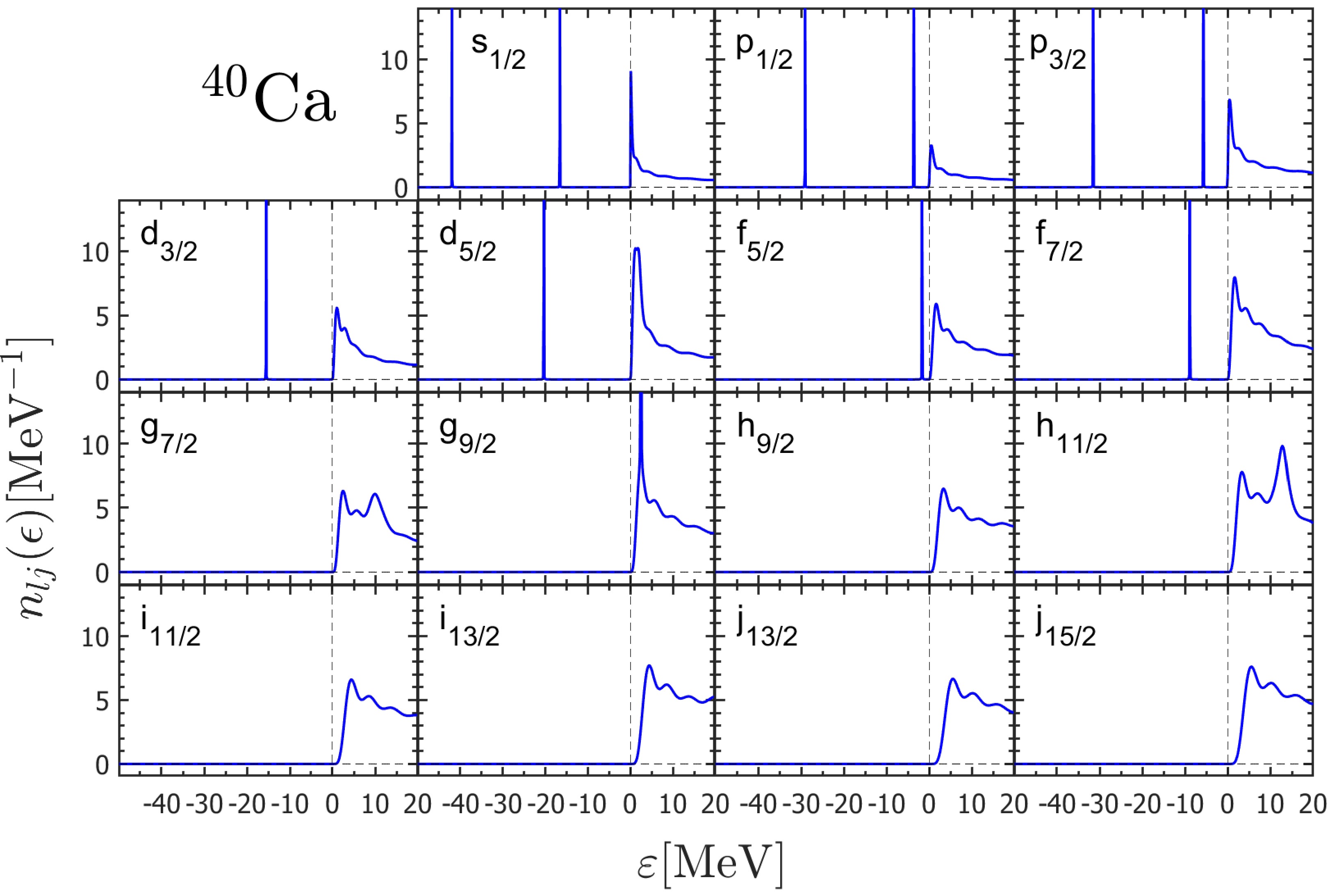 $ n_{lj}(\epsilon) $ ($ \epsilon=\varepsilon+\mathrm{i}\kappa $ with$ \kappa=1 \times 10^{-3}\ \mathrm{MeV} $ ) for different partial waves in$ { }^{40} \mathrm{Ca} $ calculated by GF method with Woods-Saxon type mean-field and spin-orbit potentials in the box$ R_{\text {max }}=20\ \mathrm{fm} $ (solid line). The dashed vertical line at$\varepsilon = 0$ marks the continuum threshold.In the energy region