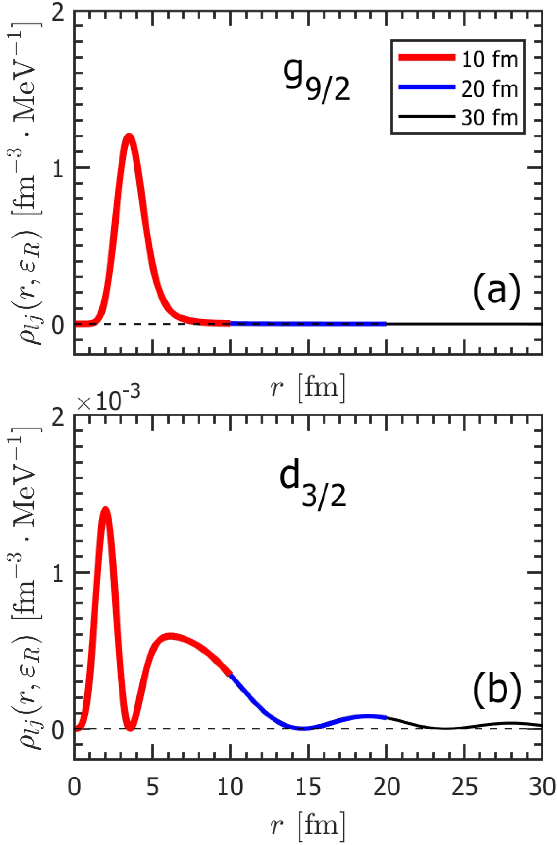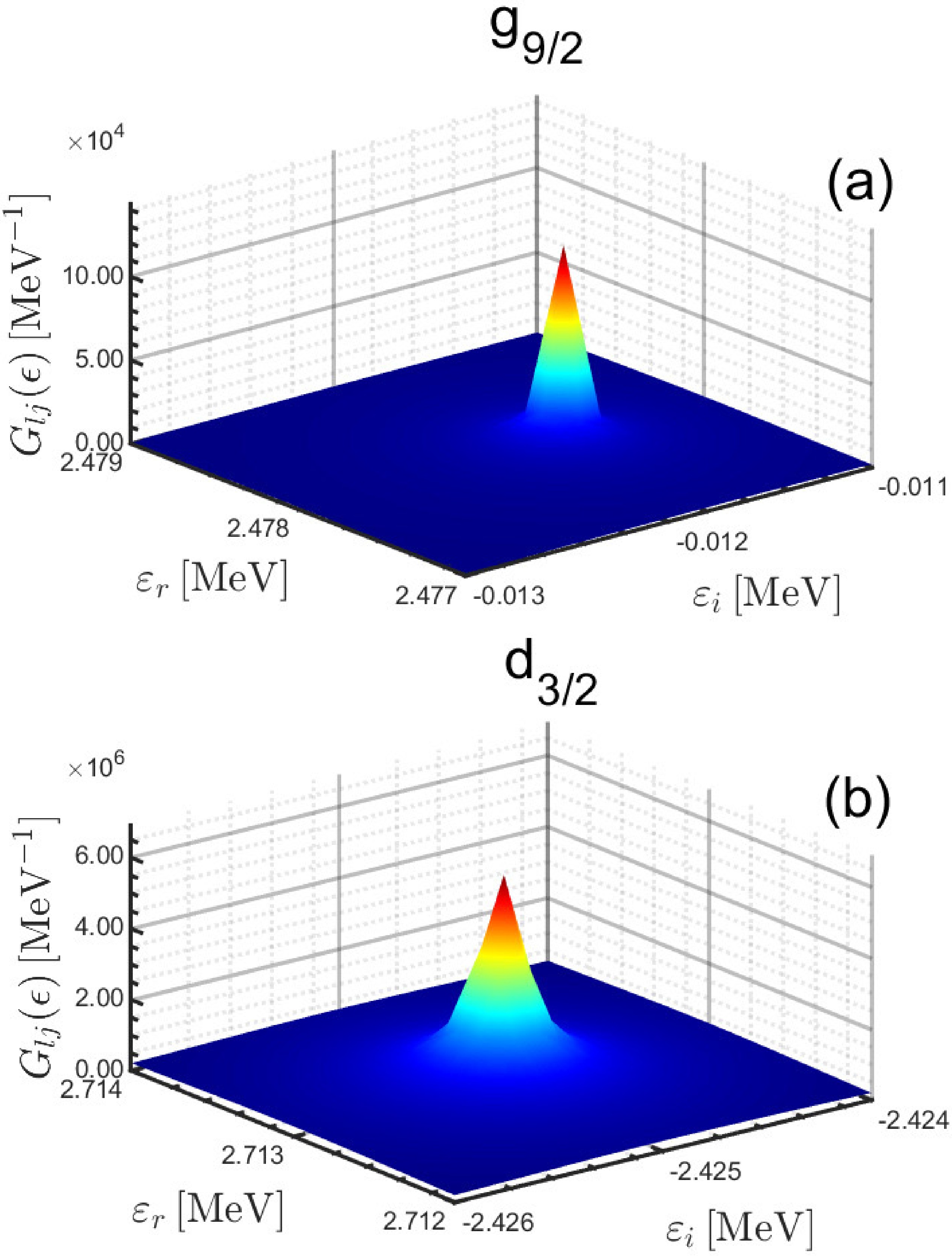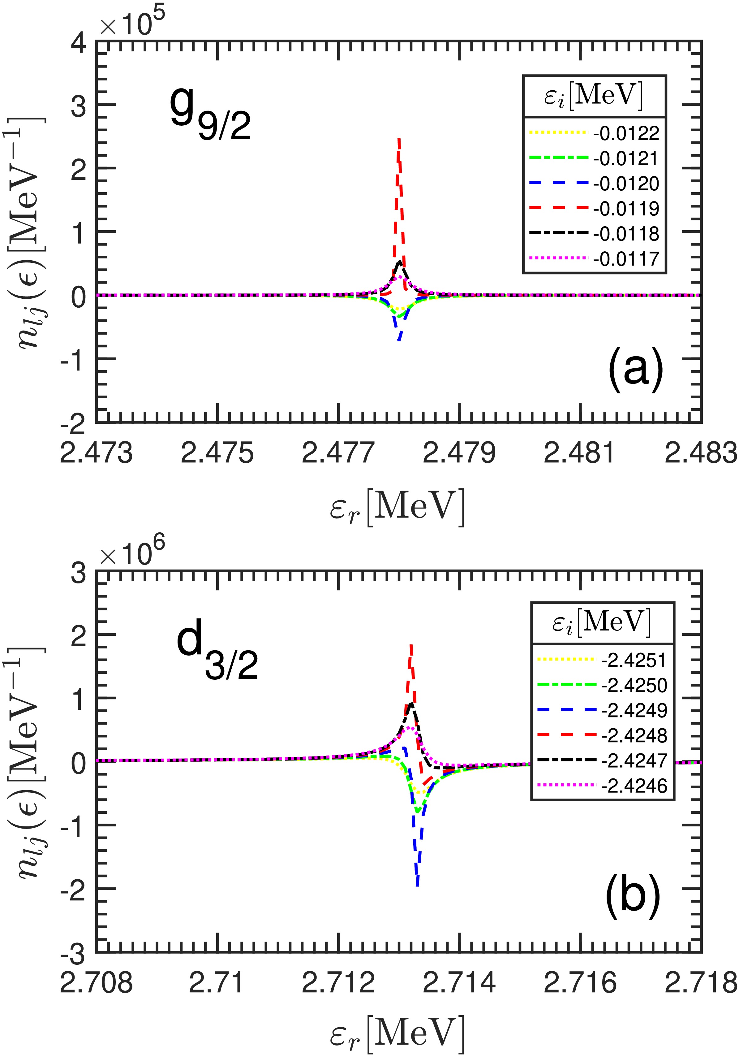 $ n_{lj}(\epsilon) $ where$ \epsilon=\varepsilon_r+\mathrm{i}\varepsilon_i $ can be calculated using the GF with scanning the real and imaginary parts of energies$ \varepsilon_r $ and$ \varepsilon_i $ in the fourth quadrant. It can be demonstrated that [58], near the energy of resonant states$ \epsilon_R=\varepsilon_R -\mathrm{i}\Gamma/2 $ ,$ \begin{array}{*{20}{l}} n_{lj}(\epsilon) & =\delta(\epsilon-\epsilon_R) \\ & =\left\{\begin{array}{c} - \dfrac{2 j+1}{\pi} \int \mathrm{d} r \operatorname{Im}\left[\mathcal{G}_{lj}(r, r ; \epsilon)\right], \\ \text { if } \varepsilon_i>-\Gamma / 2 , \\ \dfrac{2 j+1}{\pi} \int \mathrm{d} r \operatorname{Im}\left[\mathcal{G}_{lj}(r, r ; \epsilon)\right], \\ \text { if } \varepsilon_i<-\Gamma / 2 . \end{array}\right. \end{array} $